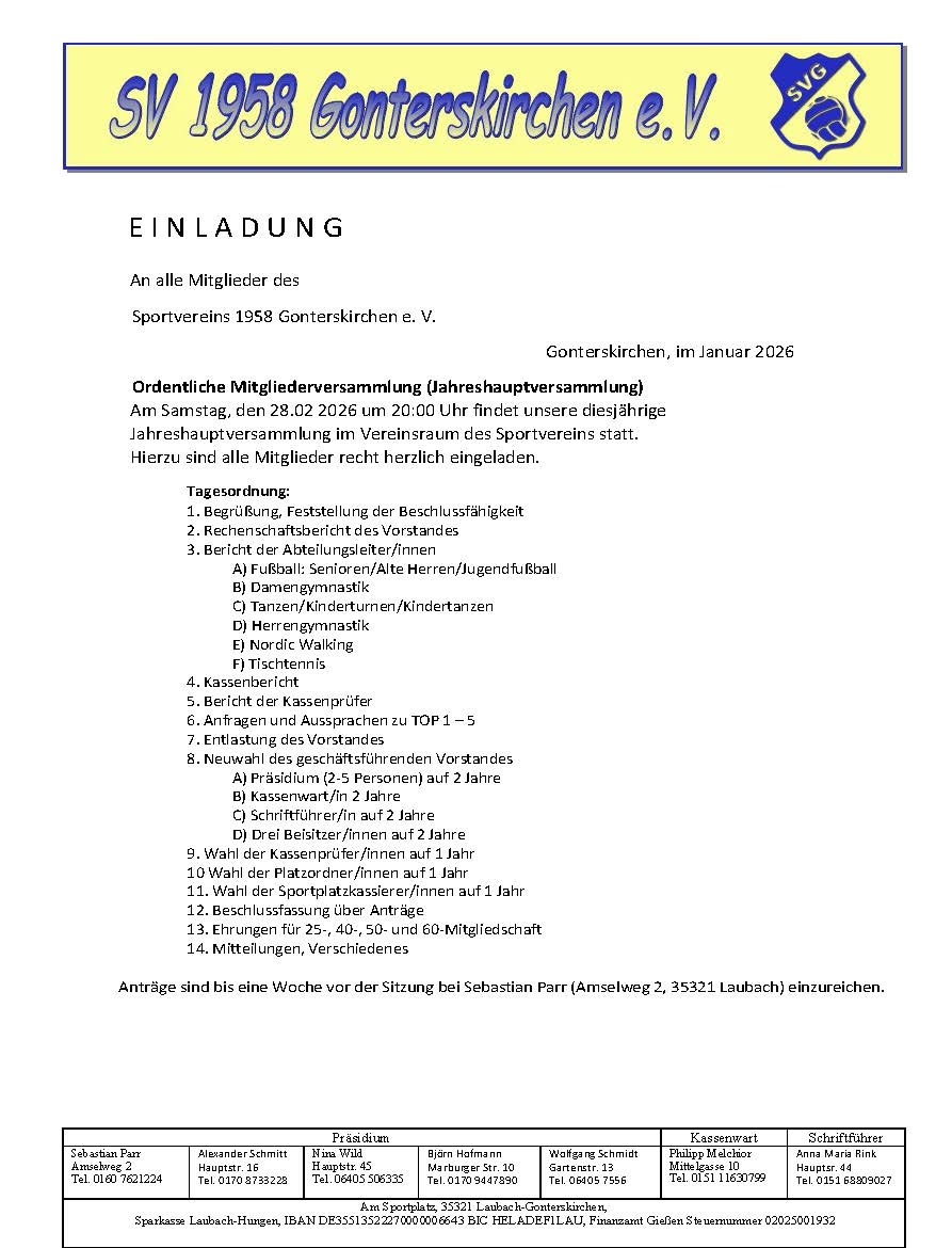 Wir, SV Gonterskirchen 1958 e.V. (Vereinssitz: Deutschland), verarbeiten zum Betrieb dieser Website personenbezogene Daten nur im technisch unbedingt notwendigen Umfang. Alle Details dazu in unserer Datenschutzerklärung.